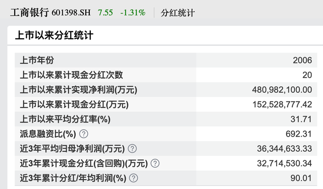 我们以工商银行为例,Wind数据显示,工商银行2006年上市以来,累计现金分红20次,总额已经高达1.5万亿元,平均分红率31.71%。